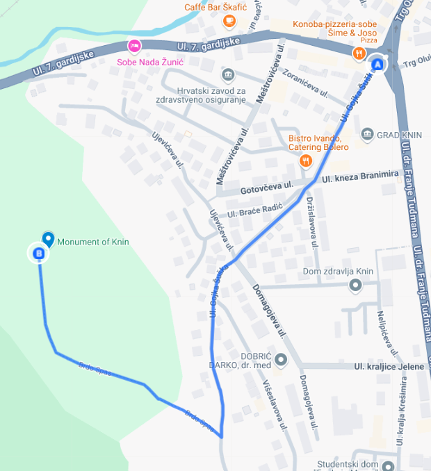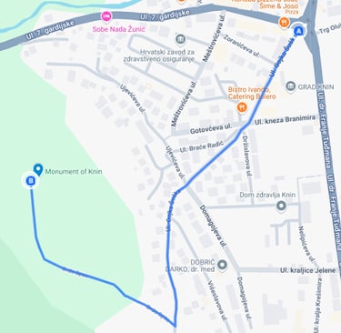 Directions: You can see on the map how to get to the monument from the roundabout in Knin, it's a 1 km walk. Make sure you wear footwear fit for hiking- the path in the hill is bumpy and there is tall grass in some places when you get to the top. Also, keep in mind that most of this road, some 700m, is uphill. There is a parking lot at the base of the fortress, so you can get there by car if you don't feel like walking all the way, but the last 400m is a walking path.